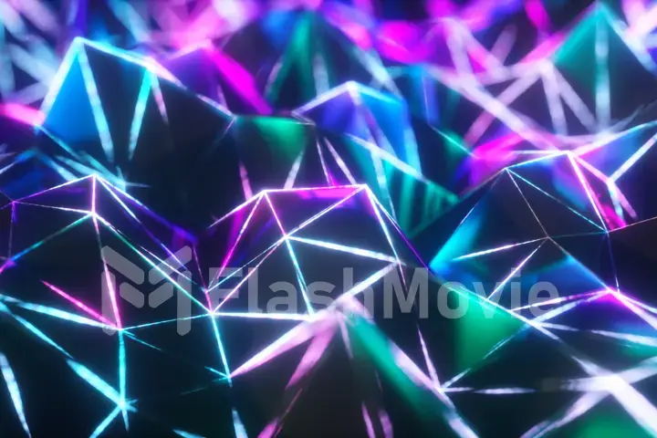 Abstract low polygonal black surface glowing at the edges. 3d illustration technology motion background. Segments of a triangle. Ultraviolet neon wireframe lines in blue violet color spectrum.