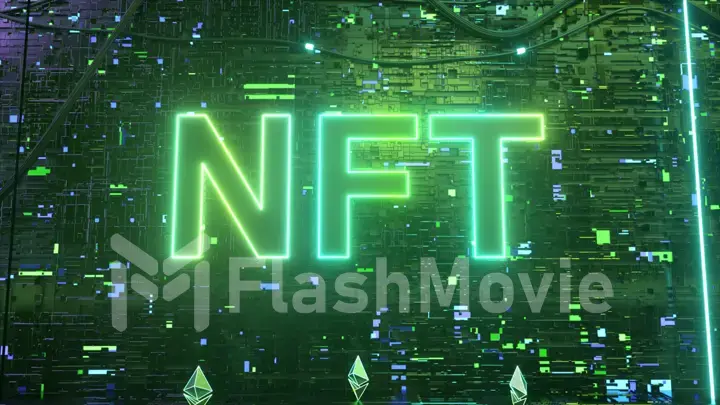 Blockchain digital data transmission room. NFT non fungible token neon concept with crypto currencies Ethereum. New way to buy digital assets, collectibles and crypto art. High quality 3d illustration
